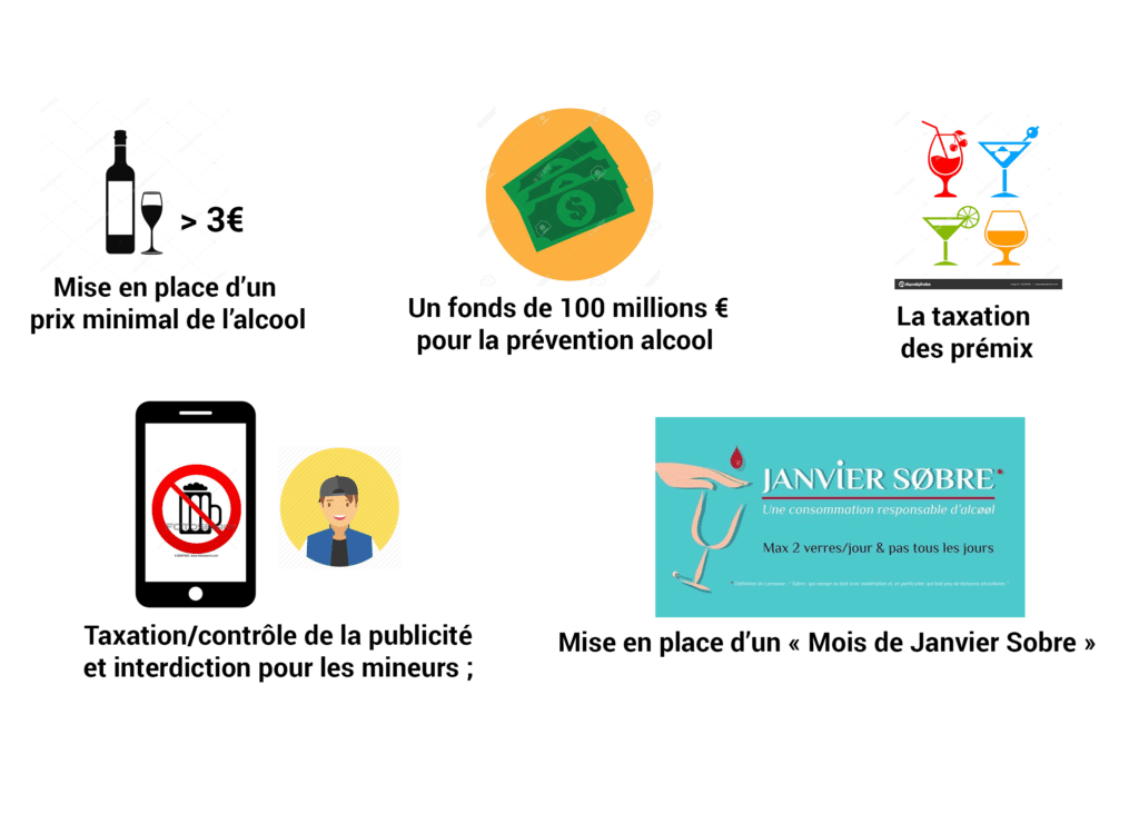 Il faut donc dénormaliser l’ivresse et les consommations excessives et montrer que ce qui se cache derrière « le bon vivant » est en réalité, bien souvent, un gros buveur ou un « alcoolique ». Pour cela, nous proposons de nous appuyer sur ces 5 mesures claires, reconnues comme efficaces par tous les experts de santé, pour promouvoir une consommation responsable :