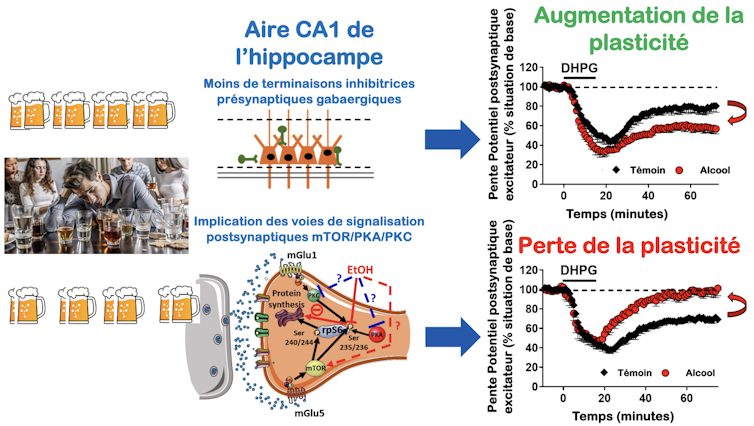 Schéma montrant l’impact d’une haute fréquence d’épisodes de binge drinking (en haut) et d’une basse fréquence (en bas) sur les mécanismes synaptiques dans l’aire CA1 de l’hippocampe jouant un rôle clé dans la mémoire. À droite, on observe qu’une haute fréquence augmente l’amplitude de la plasticité alors que la basse fréquence abolit la plasticité synaptique. Olivier Pierrefiche / Margot Debris, Fourni par l’auteur